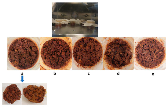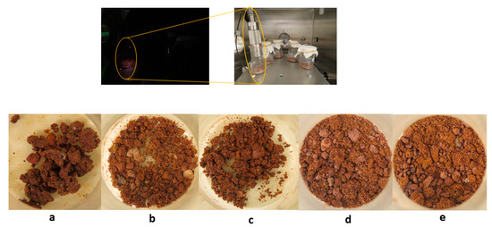 The samples were prepared in large beakers, spread over the bottom crystal, placed inside the SpaceQ, and covered with a high efficient particulate air (HEPA) filter to protect the chamber from potential micron sized splashes of the prepared mixture, which may be released abruptly during the vacuum phase. For this test, sample (b), which was equal to (a), was irradiated with a UV lamp fitted on the chamber to check if the resin was damaged upon UV exposure. The UV lamp was switched off after 1 hour(h) of irradiation. As the table temperature rose, the RH stabilized, and the experiment was stopped. The final sample mixtures are shown in Figure 5. Only the samples with a higher ratio of binder to soil were able to form conglomerate (a, b, and c). No significant difference was observed due to UV exposure (b).