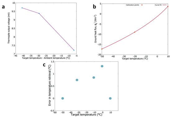 (a) Thermopile output voltage as a function of the difference between the target temperature and GTS ambient temperature. (b) Relationship between the target temperature and the ground heat flux as measured by the GTS. (c) Estimatn of error in temperature retrieval at different temperatures.