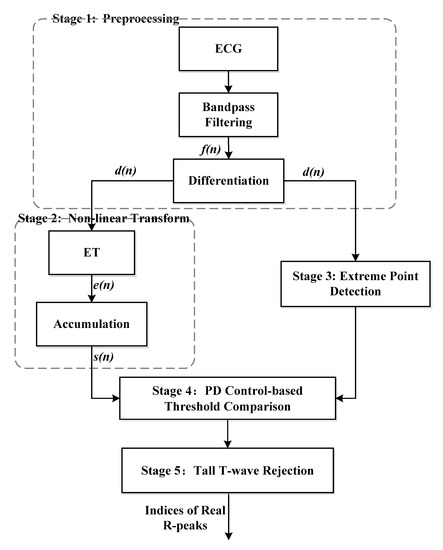 The proposed algorithm consists of five stages, namely, preprocessing, non-linear transform, extreme point detection, PD control-based threshold comparison, and tall T-wave rejection. The preprocessing stage includes a band-pass filter and first-order forward difference to enhance the QRS-complex. The non-linear transform stage first proposes the exponential transform (ET) to narrow the gap between high and low amplitude QRS-complexes, which plays an important role in the detection of small and wide QRS-complex. The third stage uses the sharp slope and high amplitude features of the QRS-complex to select the extreme points as QRS candidates. The fourth stage utilizes PD control-based adaptive threshold to further screen the QRS candidates. The mistaken tall T-waves as QRS-complexes are rejected according to the average RR interval in the last stage. The block diagram of the proposed algorithm is shown in Figure 1.