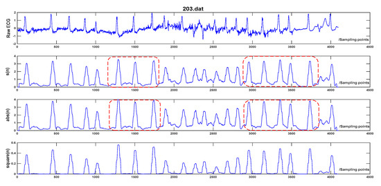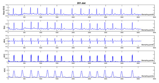 where q represents the product of normal QRS-complex duration (120 ms) and sampling frequency, and corresponds to the largest integer less than or equal to q/2. The processing result of each step is illustrated in Figure 2.