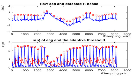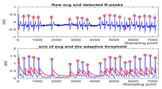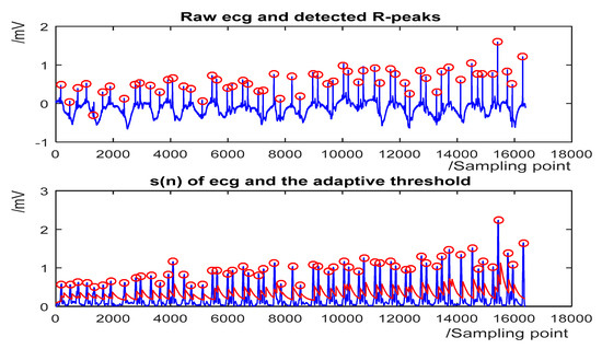 The detection results for some representative ECG segments with different morphologies and under different SNR are given in Figure 4, Figure 5, Figure 6 and Figure 7. The upper plot is the original ECG and detected R-peaks (red circle), and the lower plot of the s(n) of ECG and the adaptive threshold sequence generated by the PD control-based threshold adjustment is marked with a red line. Figure 4 shows the QRS detection result of record 203 with premature ventricular contractions (PVC) and small normal QRS. As shown in Figure 5, despite the sudden changes in the RR interval and the noise of the signal, most R peaks can be accurately detected. Figure 6 is the result of record 222 with noise and baseline wander. Figure 7 shows the result of Record 105 with baseline wander. It illustrates the good applicability and robustness of the proposed algorithm dealing with different morphologies of ECG and various noise interferences. The average processing time of QRS complex detection for a 30-min ECG record is 1.5 s, and it is fast for real-time QRS detection.