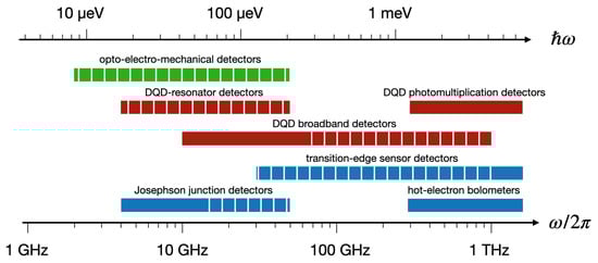 The working principle of photon detectors is based on the conversion of the impinging electromagnetic radiation into an electrical signal. Superconducting devices certainly represent a mature platform for the development of different types of photon detectors. Their working range in frequency is summarized in Figure 1. Superconducting qubits detectors have been successfully employed in the 4 to 20 GHz frequency range [,,,,,,,,,,,,,,,,,,], which is in part related to the typical level spacing in superconducting quantum devices based on Josephson junctions [], but also to the range in which control electronics is readily available. Future implementations will probably allow the extension of the maximum frequency up to ~50 GHz []. Worth mentioning is the development of quantum non-demolition detectors for either cavity [,] or itinerant [,] photons, which require no absorption and preserve the photon number []. Superconducting transition-edge sensors operating as bolometers show sharp resistance increase upon the absorption of photons []. These devices typically work at frequencies above THz, but extensions at frequencies down to 90 GHz are in progress []. Additionally, superconducting hot electron bolometers are operated above 300 GHz []. Detection schemes based on opto-electro-mechanical systems using mechanical resonators with coupled microwave and optical cavities have also been theoretically proposed [,,].