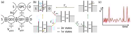 The absorption of microwave photons in a QD gives rise to inelastic electron transitions that occur either between the electronic reservoirs in the leads and the energy levels in the single dot, or between the DQD’s discrete energy levels themselves. In general, these processes are reported as photon-assisted tunneling (PAT) [,,,]. PAT in QDs can be used to develop frequency-selective detectors of quantum noise, as demonstrated by means of quantum point contact (QPC) charge detectors [,,,,]. These experiments showed the possibility to measure the photon absorption rate in a frequency range between 10 and 80 GHz with time-resolved measurements of the DQD conductivity [,]. The working principle is sketched in Figure 3. The left and right dot levels are detuned in such a way that their energy separation () matches the frequency of the incoming photons, while source-drain bias voltage () is set to zero. When the QPC is polarized, it emits microwave photons by shot noise that are subsequently absorbed by the DQD, giving rise to PAT transitions from the left to the right dot with characteristic rate . The electron then relaxes back to the initial state with typical relaxation rate MHz. These “internal” transitions are too fast to be directly detected by the nearby QPCs (bandwidth 30 kHz), thus they are not visible in the measured time trace. However, as lead-dot tunnel coupling can be kHz as in [], an additional electron can occasionally enter and leave the DQD at a slower rate. In this case, such “external” transitions can be effectively detected by the QPC and the measured rates can be related to the internal DQD transitions, allowing the estimation of the photon absorption rate [,]. With this protocol, the detector efficiency is proportional to the ratio and amounts to []. Fast detection circuits and improved DQD relaxation times are thus required in order to improve the efficiency of the detector.