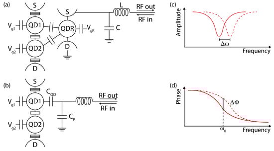As a possible alternative, gate reflectometry bridges the gap between cQED and rf reflectometry [,,,]. It makes use of lumped element sub-GHz resonators to probe changes in the tunneling capacitance due to device configuration. These resonators are typically formed by an off-chip inductance (L) and a total capacitance (C) that is the result of parasitic and QD contributions. The dot tunneling-dependent quantum capacitance [] leads to a shift in the resonance frequency (). The resonator is usually probed in the dispersive regime, where the reflected signal experiences a phase shift, consistently with a cQED input–output approach. While being currently less performant than rf-SET in terms of fidelities and bandwidth [], this technique has the advantage of requiring a simpler device design, as the resonator is connected directly to one of the gates defining the QD (with the highest lever arm possible in order to maximize the shift) instead of requiring an additional SET/QPC nearby.
