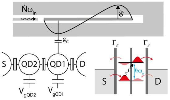 A microwave photon detector based on a DQD coupled to a microwave cavity has been recently theoretically proposed []. The schematic diagram of the detector is shown in Figure 5. A flux of microwave photons with frequency entering from a transmission line is stored in a single-port resonator with high-quality factor () and frequency . The DQD detector is appropriately configured near the charge transitions between the charge states and , where denotes electrons in the left (right) dot. In the “pumping” configuration, with and nonzero detuning (), inelastic PAT transitions lead to pumping electrons between the left and right dot, or vice versa, depending on the sign of , thus giving rise to a net source-drain current []. The spacing of the DQD levels is tuned to the frequency of the input photons () for . Tunnel couplings are also appropriately tuned in order to ensure that the dot-lead tunneling is faster than the DQD relaxation rate.