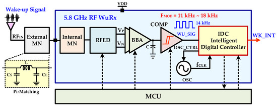 Figure 5 shows the proposed 5.8-GHz RF WuRx in which IDC is integrated to ensure its reliability and accuracy. An antenna receives the incoming RF signal and sends it to an off-chip pi-matching network. The matching network is an essential passive circuit to transfer the maximum RF signal power to the receiver circuit. The pi-matching network matches the antenna equivalent impedance with the input impedance of the proposed WuRx and ensures the maximum power transfer from the antenna to the WuRx circuit. Unlike [8,24], the chip internal matching network in addition to off-chip pi-matching receives a RF wake-up signal, boosts voltage, and improves sensitivity and |S11|. The high gain RF envelope detector recovers the baseband wake-up signal and improves signal-to-noise ratio (SNR) without additional current consumption. The RFED is a critical circuit and it interfaces WuRx with the antenna, down-converts the amplitude of the modulated RF 5.8 GHz signal, and generates a 14 kHz baseband wake-up signal. The PGA provides flexibility to improve gain and amplify the baseband signal significantly. The main control unit (MCU) enables/disables and configures different programmable parameters of RFED, baseband analog (BBA), comparator (COMP), and IDC. It can either be an on/off chip modem, externally controllable registers, or an external microcontroller. The comparator (COMP) generates digital output for IDC processing. An ultra-low power range communication (RC) oscillator (OSC) with a dynamic tuning range generates a configurable clock for the IDC block. The digital controller is proposed for ensuring WuRx reliability and accuracy by identifying and filtering non-wake-up signals. It is a fully synthesizable block, consumes very low power, and needs a very small chip area. The digital controller also replaces complex power consuming and large area interface blocks, such as ADC, BPF.