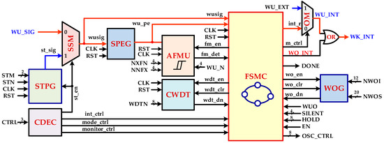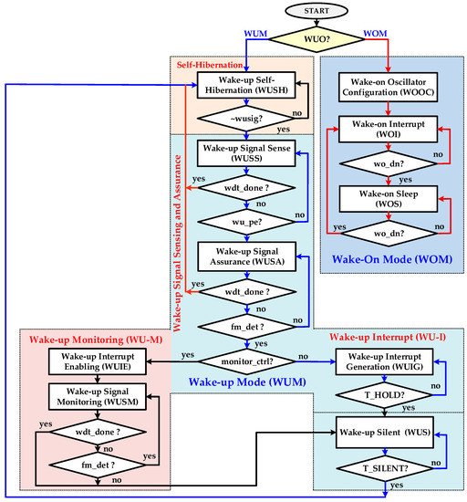 The FSMC is key building block of IDC, and its flow chart is elaborated in Figure 8. The wake-up mode with self-hibernation, digital hysteresis, and wake-up interrupt (WU-I) is the default flow in the wake-up period for ensuring WuRx reliability and accuracy. On power up, FSMC is in a wake-up self-hibernation (WUSH) state. The proposed self-hibernation technique reduces the power consumption of IDC and OSC significantly in the non-wake-up interval by configuring OSC to its lowest self-hibernation frequency, fSH. The dynamic power of a circuit is directly proportional to its operating frequency, as shown in (2). If the frequency reduces, the power consumption also reduces. When IDC detects high assertion on the wusig signal during self-hibernation, it configures OSC to its normal wake-up frequency, fWU, and waits for OSC settling in the WUSH state. The fWU is a much higher frequency than fSH for achieving higher wake-up signal measuring accuracy. The controller starts sensing a wake-up signal in the wake-up signal sense (WUSS) state. The SPEG detects wusig every rising edge and generates a wu_pe pulse signal which is sensed in the WUSS state. The controller enables CWDT by asserting a high wdt_en signal. The CWDT provides a self-recovery mechanism for FSMC and it is enabled to avoid uncertain situations and improve IDC reliability. If WU_SIG is a noise pulse or glitch, it is identified and filtered out at this stage and FSMC moves back to WUSH for self-hibernation. After the sensing stage, the controller clears CWDT by asserting a high wdt_clr signal for one clock cycle and moves to next state. The IDC verifies the WU_SIG signal in the wake-up signal assurance (WUSA) state. The AFMU evaluates WU_SIG each cycle and confirms if its frequency fSIG is in a configured range. The integrated configurable digital hysteresis technique accomplishes this task and accommodates wake-up frequency variations to improve reliability. The WU_SIG is a valid signal if its frequency fulfills the following condition described in (4) as follows: