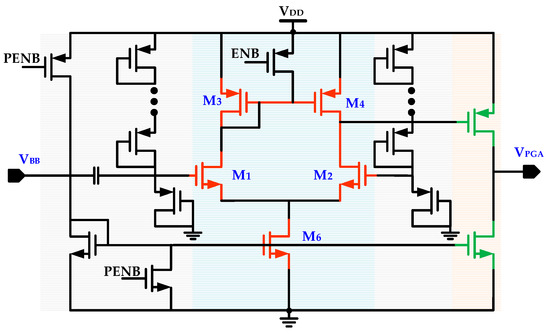 The RF front end in the proposed WuRx is composed of a high sensitivity RF envelope detector with an embedded internal matching network. The RFED-based approach is most common for designing a WuRx circuit for its low current consumption. With this scheme, the requirement of a LO generation for frequency down-conversion and RF amplification is also eliminated at the cost of reduced sensitivity. The internal matching improves sensitivity of the circuit. The RFED is the key building block in the WuRx circuit for interfacing with an antenna through a matching network and generating a baseband output signal by down-converting the input amplitude-modulated RF signal. Figure 10 illustrates the proposed RF envelope detector circuit with internal matching network [18,30]. The circuit is mainly composed of nonlinear transistor element M1, input signal DC blocking capacitor Cac, self-biasing feedback resistor Rf, impedance matching network with gate inductor Lg, and excess capacitor Cex. The impedance matching network provides passive voltage amplification. With large self-biasing resistance, when RF input signal is not present, the M1 gate to source voltage Vgs is closed to transistor threshold voltage VTH with a very negligible biasing current. In this way, the limited sensitivity issue due to VTH loss is compensated. The Rf is designed with a pseudo-resistor for large resistance with minimized parasitic capacitance and a small area. It perfectly isolates output voltage V0 from RF input signal VRF and prevents envelope detector loading. When VRF is applied, the drain current I1 exponentially increases while the biasing current supplied from M2 is almost constant.