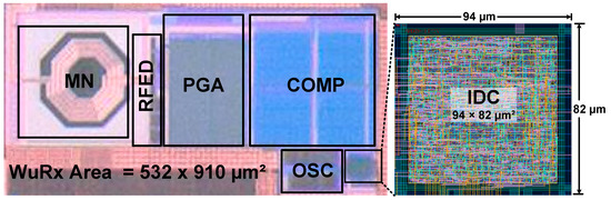 WuRx chip microphotograph and magnified IDC layout.
