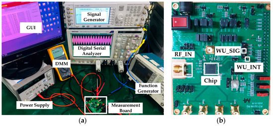 WuRx measurement: (a) experimental lab setup; (b) measurement board with chip.