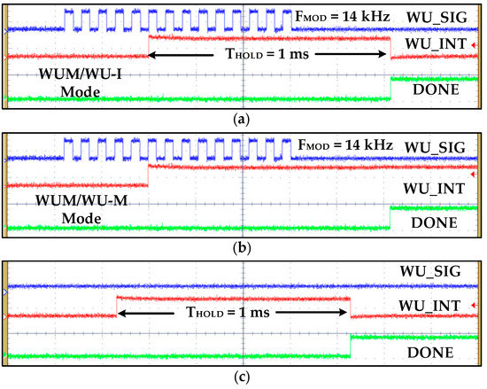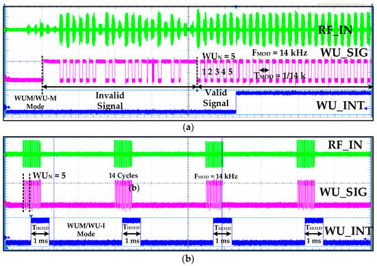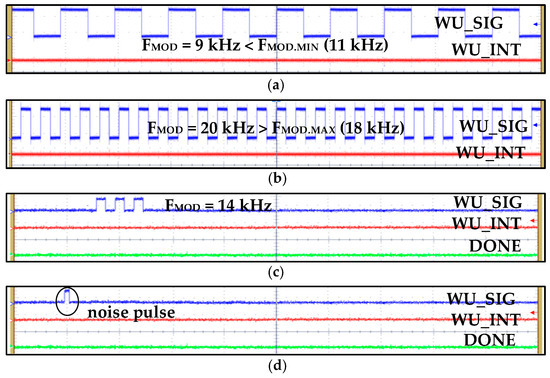 Figure 17 summarizes WuRx measurement results with false, poor, invalid signals. Figure 17a,b shows results when the WU_SIG frequency is out of the configured hysteresis range (11 kHz~18 kHz in this case) and identifies false wake-up signals. Poor and false wake-up and noise signals are also perfectly identified and WU_INT is not generated. The signal with a valid frequency but insufficient number of cycles (less than WUN = 5) is identified and filtered accurately by IDC, as shown in Figure 17c. Similarly, noise pulses and glitches in the RF signal are converted to a baseband digital signal and sensed and removed by IDC without generating interrupt and prohibits turning on the power hungry main receiver. If IDC is not integrated, then all these invalid signals are identified as wake-up signals, and as a consequence, power on transceiver falsely and degrading battery performance.