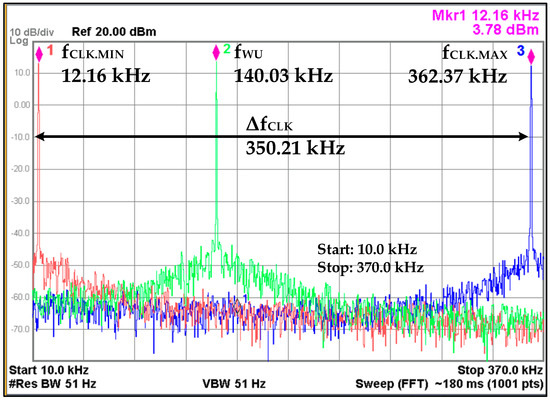 The measured tuning range of OSC is captured in Figure 19. The OSC capacitor C is implemented as binary weighted capacitor bank which is controlled from an 8-bit OSC_CTRL signal from IDC. The measured fCLK.MIN and fCLK.MAX frequencies are 12.16 kHz and 362.37 kHz when OSC_CTRL values are all high and all low, respectively, with a total frequency range ΔfCLK of 350.21 kHz. The spectrum also shows the WUM frequency which is configured as approximately 140 kHz. In self-hibernation mode, the OSC frequency fSH is configured to about 14 kHz. The WOM clock frequency depends on the configured parameters for TWOI and TWOS intervals. At fWU of 140 kHz, it draws 214 nA current from 0.9 V supply which is reduced to almost half in self-hibernation mode.