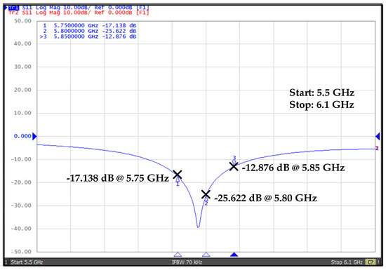 Figure 20 shows the measured reflection co-efficient, |S11|, for the proposed WuRx. The measured value of |S11| at 5.8 GHz is about −25.622 dB, which shows the excellent matching. Moreover, |S11| values at 5.75 GHz and 5.85 GHz are −17.138 dB and −12.876 dB, respectively.