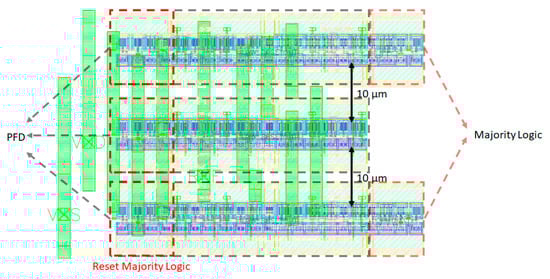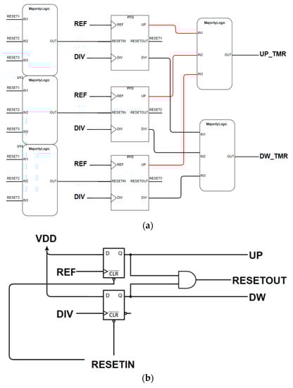 - Prinzie, J.; Steyaert, M.; Leroux, P.; Christiansen, J.; Moreira, P. A single-event upset robust, 2.2 GHz to 3.2 GHz, 345 fs jitter PLL with triple-modular redundant phase detector in 65 nm CMOS. In Proceedings of the IEEE Asian Solid-State Circuits Conference (A-SSCC) 2016, Toyama, Japan, 7–9 Nov. 2016; pp. 285–288. [Google Scholar]