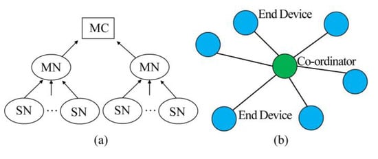 - Singh, C.K.; Kumar, A.; Ameer, P.M. Performance evaluation of an IEEE 802.15.4 sensor network with a star topology. Wirel. Netw. 2008, 14, 543–568. [Google Scholar] [CrossRef]