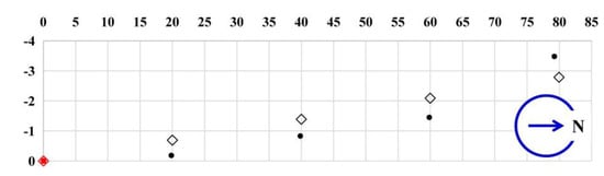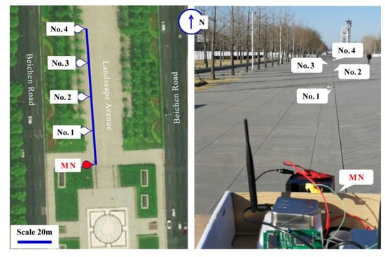 In addition to the single MN–SN test, an on-site experiment with a network of a single MN and multiple SNs was conducted on Olympic Landscape Avenue along the axis of Beijing, China (Figure 9). The tested road was approximately 1 km long and 60 m wide. There were no high-rise buildings within a few kilometers on both sides (east and west) of the road. The north of the testing site was an open land area. For this experiment, an 80 m long straight survey line was set with four SNs and one MN at 20 m intervals. The survey line had a 2° angle from the perfect North toward the West.