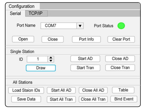 The MC console has two preset modes of serial port and network port communication. The network port uses the transmission control protocol/internet protocol (TCP/IP). Taking the actual serial port used in this study as an example, it can switch serial port and display port information. The control functions for a single SN include selecting Sn’s ID, turning on/off AD, turning on/off data transmission (Tran), and displaying real-time waveform (Draw). The control functions for multiple SNs include importing Sns’ ID list, turning on/off AD, turning on/off Tran for all of SNs, and saving data (Figure 11).
