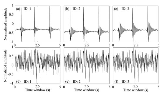The real-time seismic waveform recorded by three sensor nodes. (a–c) vibration induced by knocking and (d–f) ambient noise.