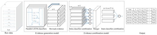 As shown in Figure 1, the stacked human activity recognition model proposed in this paper has two main sub-models, evidence generation model and evidence combination model. The former extracts features from the raw data and generate original evidence which will be revised based on the common evaluation indicators of classifiers while the latter combines evidence with a two-layer evidence combination network that synthesizes the time domain historical information and multi-classifiers results respectively.