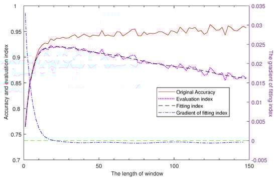 Analysis of the real time strategy. There are four curves in this figure, respectively corresponding to (―) original Accuracy, the accuracy of the two-layer LSTM network where the window length range from 1 to 150; (▪ ▪ ▪ ▪) evaluation index, the index designed to select the length of window; (– – –) fitting index, a thirteen-order polynomial used to fit the evaluation index function; (– - – - –) gradient of fitting index, the gradient of the fitting index. The first three curves refer to the left Y-axis while the last curve takes the right Y-axis as reference.