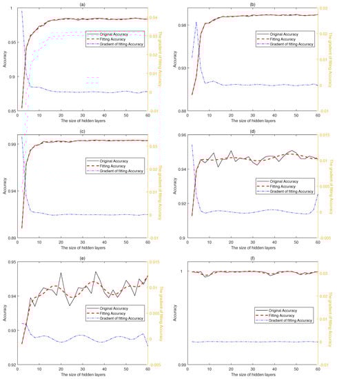 Accuracies of multi-classifiers with different hidden layer sizes. The accuracies variation of classifier 1 (a), 2 (b), 3 (c), 4 (d), 5 (e), 6 (f) corresponding to activity 1, 2, 3, 4, 5, 6 in UCI-HAR data-set.