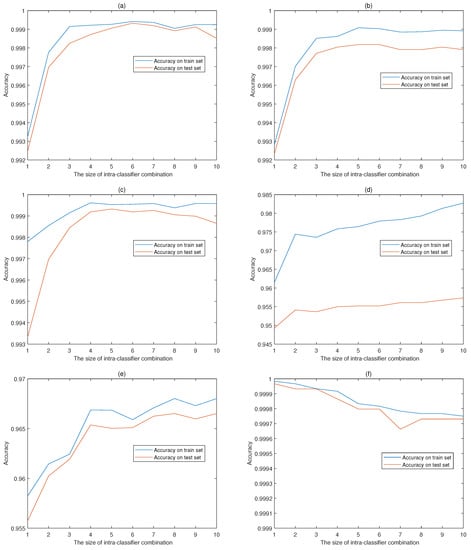 Accuracies of intra-classifier combination with different time window sizes. The intra-classifier combination accuracies of classifier 1 (a), 2 (b), 3 (c), 4 (d), 5 (e), 6 (f) corresponding to activity 1, 2, 3, 4, 5, 6 in UCI-HAR data-set.
