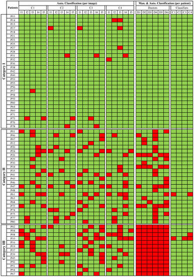 An overall view of the manual and automatic classification of every patient of the dataset; Green color: correct classification; Red color: misclassification. C1 to C4 represents the four classifiers; C1: Support Vector Machine (SVM) with polykernel, C2: SVM with Radial Basis Function (RBF), C3: k-Nearest Neighbor (kNN) and C4: Random Forest Classifier (RFC). I1 to I5 represent five testing images for each patient. D1 to D6 represent the six otolaryngologists.