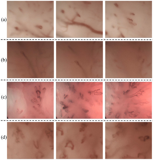 CE-NBI images were extracted from video scenes of adult patients who received a microlaryngoscopy for benign, pre-malignant or malignant lesions of the vocal folds. Video scenes were captured using an Evis Exera III Video System with integrated NBI-filter (Olympus Medical Systems, Hamburg, Germany) and a rigid 30-degree contact endoscope (Karl Storz, Tuttlingen, Germany) with a fixed magnification of 60 to have a fixed camera–tissue distance. For each video scene, we selected the time intervals where the video quality was good enough to visualize the vessels. Then, one in every ten frames was extracted from the selected intervals in JPEG format images ( pixels) to have unique and non-redundant CE-NBI images.