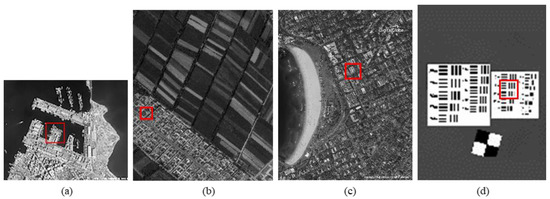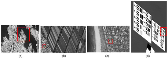 MS-CMOS conventional mode sampling simulation images: (a) seashore remote-sensing image, the chosen area is an offshore structure in an Egyptian port; (b) farmland remote-sensing image, the selected area is the crops and houses in Xinjiang, China; (c) city remote-sensing image, the selected area is buildings in Sydney; (d) target image, the selected area is minimum resolvable line pairs.