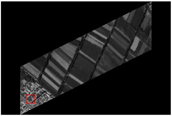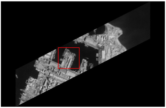 We experiment the algorithm by using MATLAB (Matrix & Laboratory software) R2016a. The experimental content includes two parts: image SR reconstruction and image deformation correction. Figure 10 shows the seashore SR image, Figure 11 shows the farmland SR image, Figure 12 shows the city SR image, Figure 13 shows the target SR image. The areas selected by the red box in each type of the images are the same, those local images will be enlarged in Section 6.3 and Section 6.4 to analyze the details.