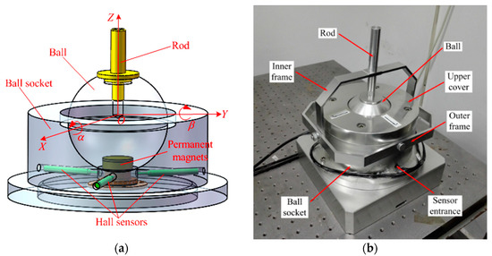 A magnetic effect method to measure the rotation angle of a precision ball joint has also been developed in our team. A cylindrical PM was embedded on the ball, and three Hall sensors were unevenly arranged in the ball socket (Figure 1a). When the ball arbitrarily rotated in the ball socket, the magnetic field rotated synchronously in space, which caused the magnetic induction intensity at the sensor position to change. The Hall sensor array captured the variation. The angles of rotation about the x and y axes, which are respectively denoted as α and β, were calculated to determine the motion direction and rotation angle of the ball club. This kind of spherical joint is named “intelligent ball joint” [13,14].