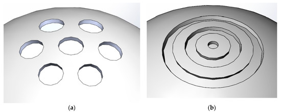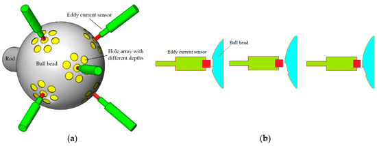 To improve the accuracy and resolution of the proposed measurement approach, the best spherical feature for the ball head must be designed and selected. The selection is based on the following requirements. First, the feature must facilitate the eddy current sensor in obtaining information and producing continuous signal output. Second, the features on the different points at the ball head should be different from each other to effectively aid the artificial neural network in establishing the model and improve the measurement accuracy. Figure 3 shows the two proposed structures. The hole group, which is easy to manufacture and exerts minimal influence on the original structure and mechanical properties of the ball head, is selected, and relevant analysis and calculation are subsequently performed.