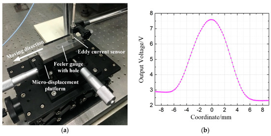 Before determining the depth and spacing of the holes in the hole group, the characteristics of the eddy current sensor output when scanning over a plane with holes should be investigated to determine the structural parameters of the hole group and form a good matching effect. Figure 4 displays the tested domestic eddy current sensor (type: cwy-do-tr-810303-01; probe diameter = 3 mm; output = 0–10 V; resolution = 0.05 μm). A feeler gauge (thickness = 0.2 mm) with a ∅6 mm hole is fixed on the micromotion stage. When the center line of the probe points to the hole center, the coordinate value is set to 0 and the feeler gauge is moved left and right at equal intervals of 0.2 mm on the micromotion stage. The output of the eddy current sensor is observed and recorded. The curve in Figure 4b shows that the eddy current sensor is effective and feasible in identifying the shape characteristics of the cylindrical hole. Moreover, the output signal of the eddy current shows a clear and continuous variation within the range of approximately 12 mm diameter around the hole, which greatly helps in determining the hole spacing in the hole group, as well as in establishing the artificial neural network model.