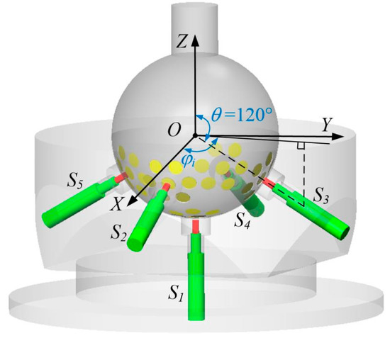 After determining the structure and size of one hole group, the number of hole groups and sensors needed in the ball joint should be calculated. Increasing the number of sensors and hole groups increases the number of the neural network inputs, and thus improves the measurement accuracy and resolution. However, the presence of excessive hole groups on the surface of the ball head will have a certain negative effect on its mechanical properties and strength. In addition, increasing the number of sensors will raise the difficulty in designing and manufacturing the ball socket. Five eddy current sensors and five hole groups are preliminarily selected. As shown in Figure 6, the center holes of the five hole groups are facing the five eddy current sensors; each sensor points to the center of the ball. The first sensor is placed on the z axis, at the lowest point of the ball socket, and the other four sensors are evenly distributed in the ball socket with a 30° inclination with respect to the XOY plane.