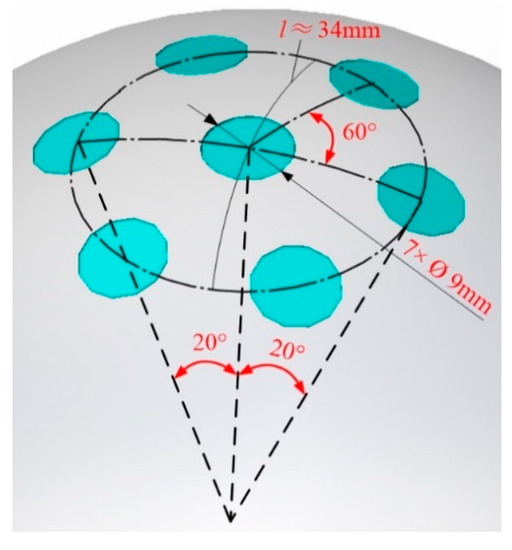 Using the data obtained in the eddy current sensor characteristic test and the experience gained from previous research on a PM–Hall sensor prototype, the preliminary design scheme of the hole group is constructed (Figure 5). A center hole is surrounded by six holes with diameters of 9 mm, and the diameter of the ball head is 100 mm. Consistent with a measurement range of ±20°, the angle between the center lines of the outer and center holes is 20°, so the arc length l is approximately 34 mm. The measurement range of the eddy current sensor is 0.5 mm; thus, the average depth of the hole is set to 0.4 mm. This size choice can ensure that the output signal of the sensor is only determined by the nearest hole and no other hole influence is superimposed.