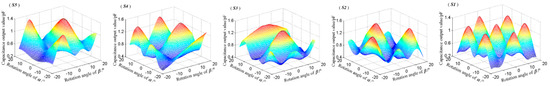 On the basis of the structural parameters of the ball head, the capacitance electrostatic field module in the ANSYS Maxwell simulation software is used to simulate the eddy current sensor because the characteristics of this sensor are similar to those of the variable area capacitance sensor. α and β are assigned with values every 2° during the simulation at a range of ±20°. The capacitance outputs are recorded after the simulation (Figure 7). The capacitance distribution curve of the outputs of Sensor 1 shows seven similar peaks, and the peak distribution is consistent with the distribution of the array holes. The amplitudes of the signals of Sensors 2–5 exhibit large variations, and the characteristic trend of each sensor is distinct, which is useful for establishing the measurement model using the artificial neural network. Conversely, the presence of multiple peaks in the output is not conducive to the modeling process because it causes the training and learning procedures to converge to the incorrect range and therefore induces error. Therefore, the structure should be simplified and the number of sensors should be reduced.