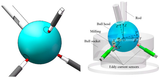 To further improve the measurement accuracy and resolution, we performed a systematic analysis of the error factors that affect the measurement accuracy [19]. The results revealed that the clearance of the ball joint is a crucial error factor. This clearance not only affected the working accuracy, but also caused the ball center to drift, which induced additional changes in the magnetic induction strength value at the location of the Hall sensor and resulted in angle measurement errors. Therefore, we embedded three eddy current sensors in the ball to detect the clearance in real time.