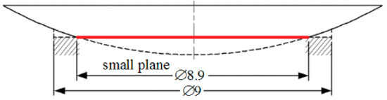 Compared with the multi-hole array model, the output of the single hole design is simple and unimodal. In addition, the availability of data is greatly improved, which is beneficial for the neural network model. The same simulation analysis is then used to analyze the scheme that involves a single hole on the ball head, and the results show that such scheme is feasible. Adopting the single-hole design scheme further reduces the overall sizes of the ball head and prototype. The structure of the single-hole prototype, whose diameter is reduced to 50 mm, is shown in Figure 8. Three holes with diameters of 9 mm are drilled in the ball head. However, because the hole depth is set in accordance to the average size (0.4 mm), the hole is relatively shallow, and the shape characteristics of the ball head no longer resemble a hole and appear as three small planes with diameters of approximately 8.9 mm (Figure 9). The matched three eddy current sensors are installed in an eccentric way relative to the hole center, that is, when the center of one sensor points to the center of the small circular plane, the other two sensors are offset. This arrangement, which is based on the measurement principle of the Vernier caliper, improves the measurement accuracy.