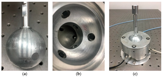 The ball joint prototype based on eddy current sensors was manufactured and assembled on the basis of the analysis and measurement feasibility simulation results. As shown in Figure 10a, three small planes with diameters of 50 mm were milled on the ball head and uniformly distributed along the circumference (θ = 110°, see Figure 6 for the definition of θ). Three holes were allocated for the installation of the eddy current sensor in the ball socket (Figure 10b). These holes were evenly distributed along the circumference (θ = 120°), and the center line of the hole points to the ball center. The part near the inner surface of the ball socket was machined with a countersunk hole to ensure that the probe was not affected by the socket metal. The prototype is shown in Figure 10c.