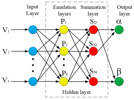 The structure of the GRNN artificial neural network is illustrated in Figure 11. The feedforward network structure was composed of the input, emulation, summation, and output layers. The number of neurons in the input layer was the same as the dimension of the input vector of the training sample. Three eddy current sensors were used (i.e., m = 3). The input layer directly passes the input variables to the pattern layer. The number of neurons in the model layer was the same as the number of training samples. The transfer function of the neurons in the emulation layer is expressed as
