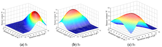 To improve the calculation accuracy of the measurement model, the new ball joint prototype was fixed on the 3D micromotion stage before the training and learning experiments. The prototype was fixed on the biaxial platform in advance so the ball joint center and the intersection of the two axes of the platform could be adjusted to coincide with the 3D micromotion stage. In the training experiment, the inner and outer frames were driven manually at an interval of 2° to provide a standard spherical motion for the ball joint in any orientation. The output voltages of the three eddy current sensors and the corresponding orientation angle values (α and β) were recorded synchronously to obtain the dataset needed to train and establish the measurement model. Finally, a 17 × 17 dataset was collected through the training experiment. The output of the three sensors is presented in Figure 13.