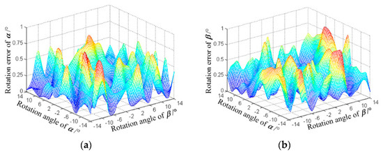The result reveals that the actual working range was ±14°, which was less than the designed range (±20°); the measurement error deviated far from ±14°. The mean square deviation of α and β within the actual working range were 19′36″ and 23′18″, respectively. When α and β were negative, the measurement error was large, but the overall error distribution was relatively uniform. The measurement error distribution is displayed in Figure 14.