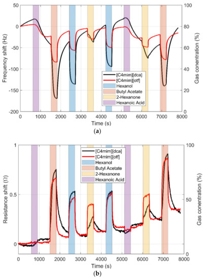 The sensors were tested in batches of four sensors (the number of the sensor slots in the sensor chamber) within a couple of weeks after fabrication. Every sensor was exposed to each VOC 12 times at its maximum concentration. Figure 1 shows the typical responses of the sensors. The red and black lines represent the evolution of the resonant frequency (up) and series resistance (down) of two sensors (in black [C4mim][dca] and in red [C4mim][otf]. The color bars represent the intervals in which the sensors were exposed to the gases. The response is not stable; in particular, hexanoic acid has a long-lasting effect on the sensors. To compensate for this drift, the response was calculated as the increment with the baseline calculated just before the gas exposure. In addition, to capture the uncompensated variation, the response and cleaning times were kept constant and the exposures to VOCs were made in a random order. This can be seen in Figure 1, where the gases are presented eight times in a random order. In this way, the measurements capture the variation caused by the drift.