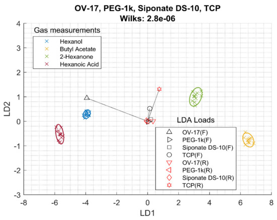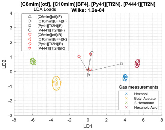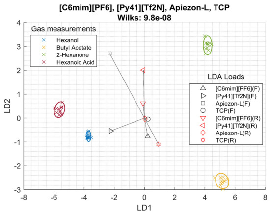 Frequency data combined with resistance data were also studied. In this case, eight features were extracted from four sensors, four frequencies and four resistances. Again, in this case, a polar RTIL ([C6mim][otf]) and three less polar RTILs ([C10mim][BF4],[P4441][Tf2N], and [Py41][Tf2N]) were selected. The linear discriminant analysis (LDA) bi-plot can be seen in Figure 2. In this plot, each cross represents one measurement and they are colored according to the VOC measured. If the separation among the groups is clear and the groups do not overlap, the system can be said to be able to separate VOCs samples, and small groups separated as much as possible is preferred. The plot also draws the LDA loads of the sensor features. A longer distance from the center means that the sensor feature is contributing more to the separation. In addition, LDA loads close to each other means that the sensor features are similar. In this case, the separation and it is quantized by the Wilks lambda as 1.2 10−4. Hexanol and hexanoic acid are close together, while butyl acetate and 2-hexanone are close to each other. Additionally, it can be seen that [Py41][Tf2N] has a very different weight compared to the other sensors, although [P4441][[T2fN] also has a high loading on the classification.