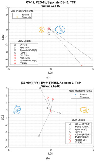 To validate the study, the best selection of a sensor to build an array measuring frequency and resistance was used to classify two different flavors: banana and pineapple. The aromas were flavors provided by Hassewaga Corporation, and they were similar as they evoked mature fruits. The organoleptic similarity between the two samples is higher than those among the previous four pure VOCs samples that evoked different aromatics. The same test was made with the best four conventional films to compare results. Figure 5 shows the LDA bi-plot of both experiments.