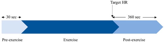 For each subject the protocol comprised three distinct phases: a pre-exercise resting phase followed by an exercising phase and subsequent post-exercise recovery phase. Following the 30 s supine resting phase the subjects underwent upright treadmill exercise to achieve their age-adjusted maximum heart rate using the Bruce protocol [9]. Immediately following exercise and after reaching the specified heart rate, subjects returned to the supine position and post-exercise recovery was recorded for 360 s. The exercise phase had variable duration according to the subjects’ cardiovascular response to the exercise and target heart rate. The protocol is illustrated in Figure 1.