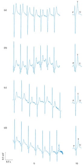 U waves were present in all subjects in pre-exercise recordings. Despite significantly increased heart rates (63 ± 8 bpm vs. 100 ± 9 bpm, p < 0.0001), U waves were also present in all subjects in post-exercise recordings following beat averaging. Figure 3 shows representative examples of U waves recovered from post-exercise recordings for four subjects (Figure 3a–d). The figure shows, for each subject, a 4 s strip of post-exercise ECG in which U waves cannot be seen due to the obscuring noise (Figure 3i). Also shown are the associated average beats generated by the algorithm in which clean and uncontaminated U waves can be readily observed for each subject (Figure 3ii).