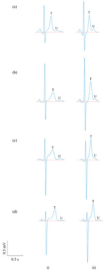 Examples comparing ECG features in (i) pre- and (ii) post-exercise recordings for four subjects (a–d). In both pre- and post-exercise recordings, U waves in the averaged beats were visible and measurable; however, U wave amplitudes were higher in the post-exercise condition in the four subjects. T wave amplitude also increased in these subjects.