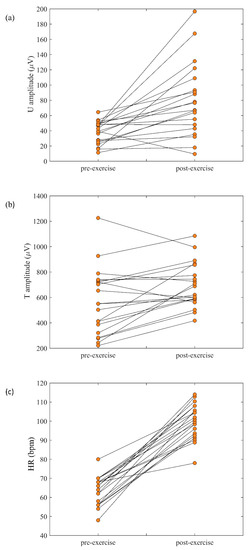 Similar to the U wave, T waves showed a significant increase in amplitudes from pre- to post-exercise (569 ± 259 µV vs. 694 ± 175 µV, p = 0.006) (Table 1, Figure 5b). Sixteen of the 20 subjects exhibited T wave amplitude increases post-exercise.