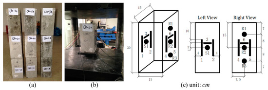 According to the design specification JGJ55-2011, three types of ordinary concrete, corresponding to the strength grades of C30, C40 and C50, were made with cement, water, sand grain, stone and superplasticizer. Their mix proportions and mechanical properties are listed in Table 1. For each type of concrete, 4 identical specimens with dimensions of 15 × 15 × 30-cm were casted and maintained in a curing room of 20 ± 2 °C and 95% humidity (GB/T50081-2002 standard) for several weeks. After maintenance, one specimen from each type was selected randomly to examine its ultimate strength through a creep test. The measured results agreed with their theoretical break-down stresses, indicating that the productive processes well follow the design specifications. Then, as shown in Figure 1a, the remaining specimens were numbered in groups prepared for the later experiments, e.g., the label C30-2 denotes the second sample of the concrete type C30.
